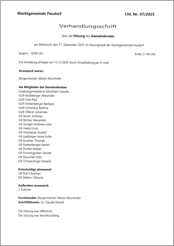 Gemeinderatsprotokoll vom 17.12.2025